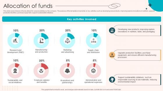 This slide covers division of funds utilized for several activities by the company. The purpose of this template is to provide on key activities such as developing new products, improving explore innovations in nutrition, upgrade production facilities, purchase equipment, support sustainability initiatives. Find a pre-designed and impeccable Allocation Of Funds Retail Merchandising Company Investor Funding Elevator Pitch Deck Ppt Sample. The templates can ace your presentation without additional effort. You can download these easy-to-edit presentation templates to make your presentation stand out from others. So, what are you waiting for Download the template from Slidegeeks today and give a unique touch to your presentation. This slide covers division of funds utilized for several activities by the company. The purpose of this template is to provide on key activities such as developing new products, improving explore innovations in nutrition, upgrade production facilities, purchase equipment, support sustainability initiatives.