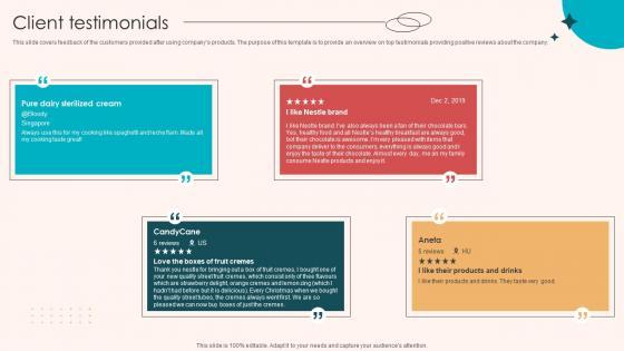 This slide covers feedback of the customers provided after using companys products. The purpose of this template is to provide an overview on top testimonials providing positive reviews about the company. Create an editable Client Testimonials Retail Merchandising Company Investor Funding Elevator Pitch Deck Ppt Template that communicates your idea and engages your audience. Whether you are presenting a business or an educational presentation, pre-designed presentation templates help save time. Client Testimonials Retail Merchandising Company Investor Funding Elevator Pitch Deck Ppt Template is highly customizable and very easy to edit, covering many different styles from creative to business presentations. Slidegeeks has creative team members who have crafted amazing templates. So, go and get them without any delay. This slide covers feedback of the customers provided after using companys products. The purpose of this template is to provide an overview on top testimonials providing positive reviews about the company.