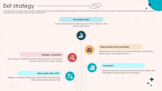 This slide covers exit strategy of the company for helping owners or investors achieve their financial objectives The purpose of this template is to provide an overview on strategies such as initial public offer, strategic acquisition, secondary sales, repurchase by the promoters, liquidation, etc. From laying roadmaps to briefing everything in detail, our templates are perfect for you. You can set the stage with your presentation slides. All you have to do is download these easy-to-edit and customizable templates. Exit Strategy Retail Merchandising Company Investor Funding Elevator Pitch Deck Ppt Example will help you deliver an outstanding performance that everyone would remember and praise you for. Do download this presentation today. This slide covers exit strategy of the company for helping owners or investors achieve their financial objectives The purpose of this template is to provide an overview on strategies such as initial public offer, strategic acquisition, secondary sales, repurchase by the promoters, liquidation, etc.