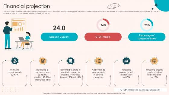 This slide covers financial projections of the company based on sales, underlying trading operating profit. The purpose of this template is to provide an overview on projections such as increasing organic growth by 9.3 percent , e-commerce sales by 13.6 percent, earning per share between 6-10 percent, etc. Slidegeeks is here to make your presentations a breeze with Financial Projection Retail Merchandising Company Investor Funding Elevator Pitch Deck Ppt Slides With our easy-to-use and customizable templates, you can focus on delivering your ideas rather than worrying about formatting. With a variety of designs to choose from, you are sure to find one that suits your needs. And with animations and unique photos, illustrations, and fonts, you can make your presentation pop. So whether you are giving a sales pitch or presenting to the board, make sure to check out Slidegeeks first This slide covers financial projections of the company based on sales, underlying trading operating profit. The purpose of this template is to provide an overview on projections such as increasing organic growth by 9.3 percent , e-commerce sales by 13.6 percent, earning per share between 6-10 percent, etc.