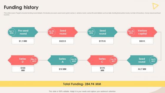 This slide covers Targets investor funding round details. It includes pre seed, seed round, grant, series A, venture round, series B round details such as date, funding transaction name, number of investors, money raised and lead investor. Do you have an important presentation coming up Are you looking for something that will make your presentation stand out from the rest Look no further than Funding History Retail Store Investor Elevator Pitch Deck. With our professional designs, you can trust that your presentation will pop and make delivering it a smooth process. And with Slidegeeks, you can trust that your presentation will be unique and memorable. So why wait Grab Funding History Retail Store Investor Elevator Pitch Deck today and make your presentation stand out from the rest This slide covers Targets investor funding round details. It includes pre seed, seed round, grant, series A, venture round, series B round details such as date, funding transaction name, number of investors, money raised and lead investor.