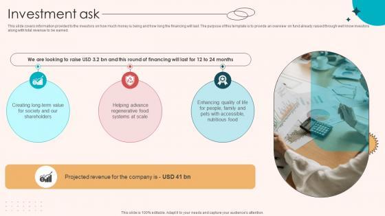 This slide covers information provided to the investors on how much money is being and how long the financing will last. The purpose of this template is to provide an overview on fund already raised through well know investors along with total revenue to be earned. Find highly impressive Investment Ask Retail Merchandising Company Investor Funding Elevator Pitch Deck Ppt Example on Slidegeeks to deliver a meaningful presentation. You can save an ample amount of time using these presentation templates. No need to worry to prepare everything from scratch because Slidegeeks experts have already done a huge research and work for you. You need to download Investment Ask Retail Merchandising Company Investor Funding Elevator Pitch Deck Ppt Example for your upcoming presentation. All the presentation templates are 100 percent editable and you can change the color and personalize the content accordingly. Download now This slide covers information provided to the investors on how much money is being and how long the financing will last. The purpose of this template is to provide an overview on fund already raised through well know investors along with total revenue to be earned.