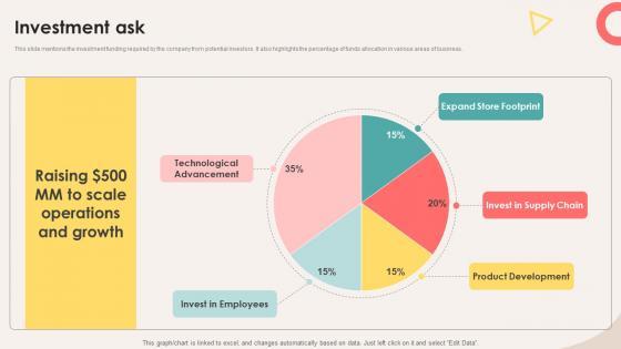 This slide mentions the investment funding required by the company from potential investors. It also highlights the percentage of funds allocation in various areas of business. Find highly impressive Investment Ask Retail Store Investor Elevator Pitch Deck on Slidegeeks to deliver a meaningful presentation. You can save an ample amount of time using these presentation templates. No need to worry to prepare everything from scratch because Slidegeeks experts have already done a huge research and work for you. You need to download Investment Ask Retail Store Investor Elevator Pitch Deck for your upcoming presentation. All the presentation templates are 100 percent editable and you can change the color and personalize the content accordingly. Download now This slide mentions the investment funding required by the company from potential investors. It also highlights the percentage of funds allocation in various areas of business.