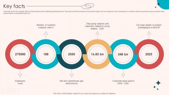 This slide covers key insights of the company that assists in attracting potential clients. The purpose of this template is to provide insights such as employees count, operations in countries, net zero greenhouse gas emissions, total group salaries, corporate tax paid, etc. If your project calls for a presentation, then Slidegeeks is your go-to partner because we have professionally designed, easy-to-edit templates that are perfect for any presentation. After downloading, you can easily edit Key Facts Retail Merchandising Company Investor Funding Elevator Pitch Deck Ppt Slides and make the changes accordingly. You can rearrange slides or fill them with different images. Check out all the handy templates This slide covers key insights of the company that assists in attracting potential clients. The purpose of this template is to provide insights such as employees count, operations in countries, net zero greenhouse gas emissions, total group salaries, corporate tax paid, etc.