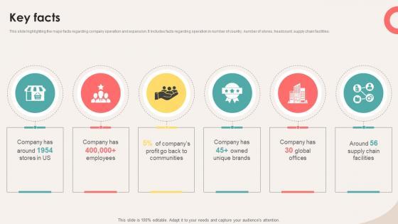 This slide highlighting the major facts regarding company operation and expansion. It includes facts regarding operation in number of country, number of stores, headcount, supply chain facilities. If your project calls for a presentation, then Slidegeeks is your go-to partner because we have professionally designed, easy-to-edit templates that are perfect for any presentation. After downloading, you can easily edit Key Facts Retail Store Investor Elevator Pitch Deck and make the changes accordingly. You can rearrange slides or fill them with different images. Check out all the handy templates This slide highlighting the major facts regarding company operation and expansion. It includes facts regarding operation in number of country, number of stores, headcount, supply chain facilities.