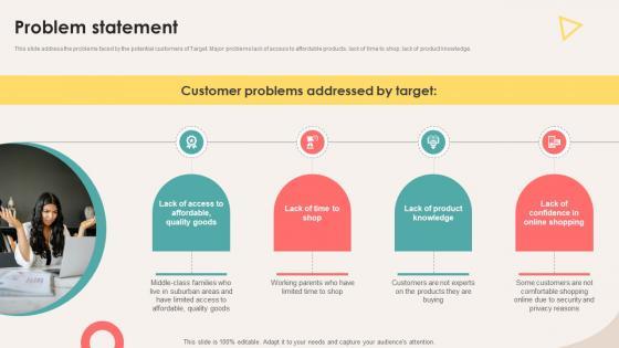 This slide address the problems faced by the potential customers of Target. Major problems lack of access to affordable products, lack of time to shop, lack of product knowledge. Formulating a presentation can take up a lot of effort and time, so the content and message should always be the primary focus. The visuals of the PowerPoint can enhance the presenters message, so our Problem Statement Retail Store Investor Elevator Pitch Deck was created to help save time. Instead of worrying about the design, the presenter can concentrate on the message while our designers work on creating the ideal templates for whatever situation is needed. Slidegeeks has experts for everything from amazing designs to valuable content, we have put everything into Problem Statement Retail Store Investor Elevator Pitch Deck. This slide address the problems faced by the potential customers of Target. Major problems lack of access to affordable products, lack of time to shop, lack of product knowledge.