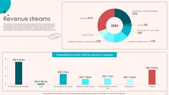 This slide covers breakdown of revenue earned by the company through product sales. The revenue breakdown includes streams such as pet care, powered and liquid beverage, confectionery, water, prepared dishes and cooking aids, milk products and ice-cream and nutrition and health science, etc. This modern and well-arranged Revenue Streams Retail Merchandising Company Investor Funding Elevator Pitch Deck Ppt Slides provides lots of creative possibilities. It is very simple to customize and edit with the Powerpoint Software. Just drag and drop your pictures into the shapes. All facets of this template can be edited with Powerpoint, no extra software is necessary. Add your own material, put your images in the places assigned for them, adjust the colors, and then you can show your slides to the world, with an animated slide included. This slide covers breakdown of revenue earned by the company through product sales. The revenue breakdown includes streams such as pet care, powered and liquid beverage, confectionery, water, prepared dishes and cooking aids, milk products and ice-cream and nutrition and health science, etc.