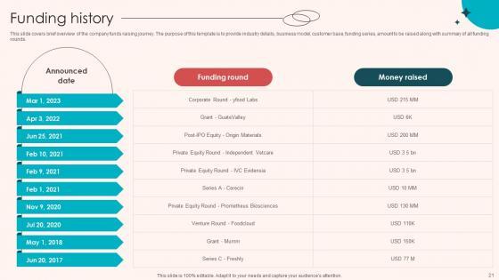 This slide covers brief overview of the company funds raising journey. The purpose of this template is to provide industry details, business model, customer base, funding series, amount to be raised along with summary of all funding rounds. Do you have an important presentation coming up Are you looking for something that will make your presentation stand out from the rest Look no further than Funding History Retail Merchandising Company Investor Funding Elevator Pitch Deck Ppt Sample. With our professional designs, you can trust that your presentation will pop and make delivering it a smooth process. And with Slidegeeks, you can trust that your presentation will be unique and memorable. So why wait Grab Funding History Retail Merchandising Company Investor Funding Elevator Pitch Deck Ppt Sample today and make your presentation stand out from the rest This slide covers brief overview of the company funds raising journey. The purpose of this template is to provide industry details, business model, customer base, funding series, amount to be raised along with summary of all funding rounds.