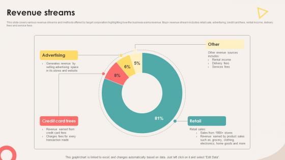 This slide covers various revenue streams and methods offered by target corporation highlighting how the business earns revenue. Major revenue stream includes retail sale, advertising, credit card fees, rental income, delivery fees and service fees. This modern and well-arranged Revenue Streams Retail Store Investor Elevator Pitch Deck provides lots of creative possibilities. It is very simple to customize and edit with the Powerpoint Software. Just drag and drop your pictures into the shapes. All facets of this template can be edited with Powerpoint, no extra software is necessary. Add your own material, put your images in the places assigned for them, adjust the colors, and then you can show your slides to the world, with an animated slide included. This slide covers various revenue streams and methods offered by target corporation highlighting how the business earns revenue. Major revenue stream includes retail sale, advertising, credit card fees, rental income, delivery fees and service fees.