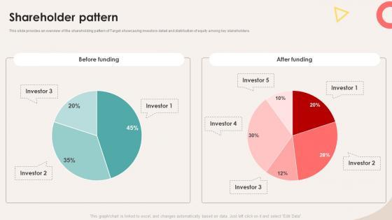 This slide provides an overview of the shareholding pattern of Target showcasing investors detail and distribution of equity among key stakeholders. This Shareholder Pattern Retail Store Investor Elevator Pitch Deck is perfect for any presentation, be it in front of clients or colleagues. It is a versatile and stylish solution for organizing your meetings. The Shareholder Pattern Retail Store Investor Elevator Pitch Deck features a modern design for your presentation meetings. The adjustable and customizable slides provide unlimited possibilities for acing up your presentation. Slidegeeks has done all the homework before launching the product for you. So, do not wait, grab the presentation templates today This slide provides an overview of the shareholding pattern of Target showcasing investors detail and distribution of equity among key stakeholders.