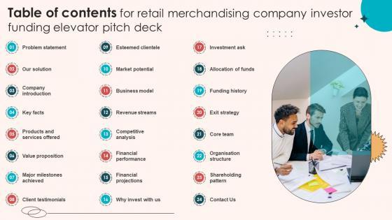 Welcome to our selection of the Table Of Contents For Retail Merchandising Company Investor Funding Elevator Pitch Deck Ppt Slides. These are designed to help you showcase your creativity and bring your sphere to life. Planning and Innovation are essential for any business that is just starting out. This collection contains the designs that you need for your everyday presentations. All of our PowerPoints are 100Percent editable, so you can customize them to suit your needs. This multi-purpose template can be used in various situations. Grab these presentation templates today. Our Table Of Contents For Retail Merchandising Company Investor Funding Elevator Pitch Deck Ppt Slides are topically designed to provide an attractive backdrop to any subject. Use them to look like a presentation pro.