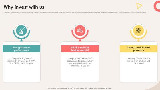 This slide mentions the various reasons why potential investors should be investing with the company. Key reasons strong financial performance, inflation resistant business model and strong omnichannel presence. The best PPT templates are a great way to save time, energy, and resources. Slidegeeks have 100 percent editable powerpoint slides making them incredibly versatile. With these quality presentation templates, you can create a captivating and memorable presentation by combining visually appealing slides and effectively communicating your message. Download Why Invest With Us Retail Store Investor Elevator Pitch Deck from Slidegeeks and deliver a wonderful presentation. This slide mentions the various reasons why potential investors should be investing with the company. Key reasons strong financial performance, inflation resistant business model and strong omnichannel presence.