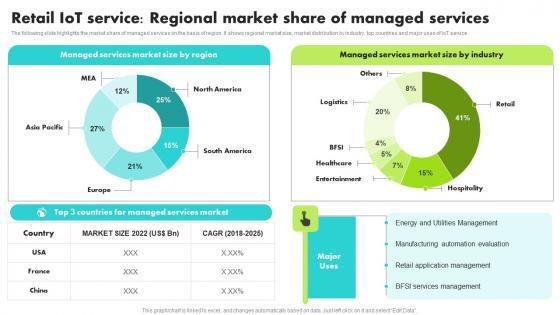 The following slide highlights the market share of managed services on the basis of region. It shows regional market size, market distribution by industry, top countries and major uses of IoT service Formulating a presentation can take up a lot of effort and time, so the content and message should always be the primary focus. The visuals of the PowerPoint can enhance the presenters message, so our Retail IoT Service Regional How Industrial IoT Is Changing Worldwide Template Pdf was created to help save time. Instead of worrying about the design, the presenter can concentrate on the message while our designers work on creating the ideal templates for whatever situation is needed. Slidegeeks has experts for everything from amazing designs to valuable content, we have put everything into Retail IoT Service Regional How Industrial IoT Is Changing Worldwide Template Pdf The following slide highlights the market share of managed services on the basis of region. It shows regional market size, market distribution by industry, top countries and major uses of IoT service