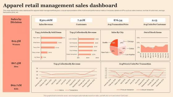 This slide depicts the sales dashboard for apparel retail management that gives a visual representation of the most recent performance metrics. It includes details on KPIs such as sales revenue, number of customers, average transaction price, etc.Pitch your topic with ease and precision using this Apparel Retail Management Sales Dashboard Professional Pdf This layout presents information on Sales Revenue, Transaction Price, Units Per Customer It is also available for immediate download and adjustment. So, changes can be made in the color, design, graphics or any other component to create a unique layout. This slide depicts the sales dashboard for apparel retail management that gives a visual representation of the most recent performance metrics. It includes details on KPIs such as sales revenue, number of customers, average transaction price, etc.