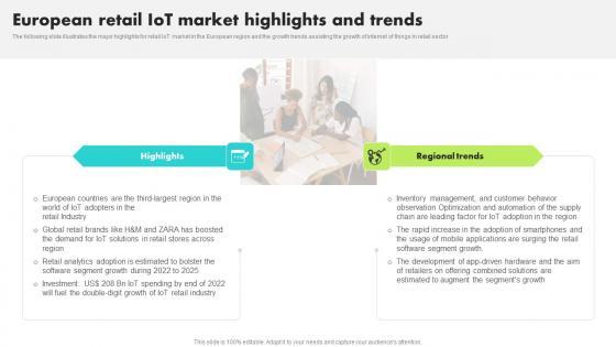 The following slide illustrates the major highlights for retail IoT market in the European region and the growth trends assisting the growth of internet of things in retail sector Slidegeeks is one of the best resources for PowerPoint templates. You can download easily and regulate European Retail IoT Market How Industrial IoT Is Changing Worldwide Pictures Pdf for your personal presentations from our wonderful collection. A few clicks is all it takes to discover and get the most relevant and appropriate templates. Use our Templates to add a unique zing and appeal to your presentation and meetings. All the slides are easy to edit and you can use them even for advertisement purposes. The following slide illustrates the major highlights for retail IoT market in the European region and the growth trends assisting the growth of internet of things in retail sector