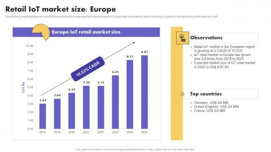 The following slide highlights the market value and forecast of retail internet of things industry in Europe with observations. It also shows top countries in the region along with revenue CAGR.. Find a pre-designed and impeccable Deploying Iot Solutions In The Retail Market Retail Iot Market Size Europe Designs PDF. The templates can ace your presentation without additional effort. You can download these easy-to-edit presentation templates to make your presentation stand out from others. So, what are you waiting for Download the template from Slidegeeks today and give a unique touch to your presentation.