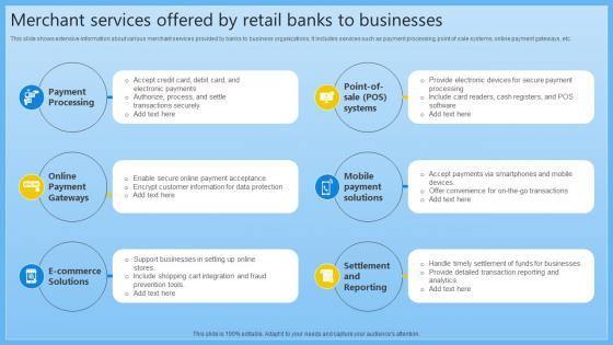 This slide shows extensive information about various merchant services provided by banks to business organizations. It includes services such as payment processing, point of sale systems, online payment gateways, etc. From laying roadmaps to briefing everything in detail, our templates are perfect for you. You can set the stage with your presentation slides. All you have to do is download these easy-to-edit and customizable templates. Beginners Guide To Commercial Merchant Services Offered By Retail Banks Fin SS V will help you deliver an outstanding performance that everyone would remember and praise you for. Do download this presentation today. This slide shows extensive information about various merchant services provided by banks to business organizations. It includes services such as payment processing, point of sale systems, online payment gateways, etc.