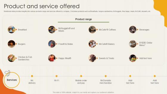 Mentioned slide provides insights into various products range and services offered by company. It includes products such as Breakfasts, burgers sandwiches, McNuggets, fries happy meals, McCafe, desserts, etc. Are you searching for a Product And Service Offered Food Retailer Company Profile Ppt Sample CP SS V that is uncluttered, straightforward, and original Its easy to edit, and you can change the colors to suit your personal or business branding. For a presentation that expresses how much effort you have put in, this template is ideal With all of its features, including tables, diagrams, statistics, and lists, its perfect for a business plan presentation. Make your ideas more appealing with these professional slides. Download Product And Service Offered Food Retailer Company Profile Ppt Sample CP SS V from Slidegeeks today. Mentioned slide provides insights into various products range and services offered by company. It includes products such as Breakfasts, burgers sandwiches, McNuggets, fries happy meals, McCafe, desserts, etc.