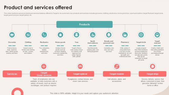 This slide mentions various products and services features offered by Target to its customers. Key products and services includes groceries, clothing, electronics, home good, toys, sport and outdoor, target Redcard, target circle, target guest services, target optical, etc. Coming up with a presentation necessitates that the majority of the effort goes into the content and the message you intend to convey. The visuals of a PowerPoint presentation can only be effective if it supplements and supports the story that is being told. Keeping this in mind our experts created Product And Services Offered Retail Store Investor Elevator Pitch Deck to reduce the time that goes into designing the presentation. This way, you can concentrate on the message while our designers take care of providing you with the right template for the situation. This slide mentions various products and services features offered by Target to its customers. Key products and services includes groceries, clothing, electronics, home good, toys, sport and outdoor, target Redcard, target circle, target guest services, target optical, etc.
