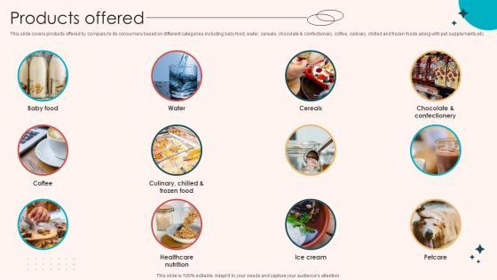 This slide covers products offered by company to its consumers based on different categories including baby food, water, cereals, chocolate and confectionary, coffee, culinary, chilled and frozen foods along with pet supplements,etc. Coming up with a presentation necessitates that the majority of the effort goes into the content and the message you intend to convey. The visuals of a PowerPoint presentation can only be effective if it supplements and supports the story that is being told. Keeping this in mind our experts created Products Offered Retail Merchandising Company Investor Funding Elevator Pitch Deck Ppt Sample to reduce the time that goes into designing the presentation. This way, you can concentrate on the message while our designers take care of providing you with the right template for the situation. This slide covers products offered by company to its consumers based on different categories including baby food, water, cereals, chocolate and confectionary, coffee, culinary, chilled and frozen foods along with pet supplements,etc.