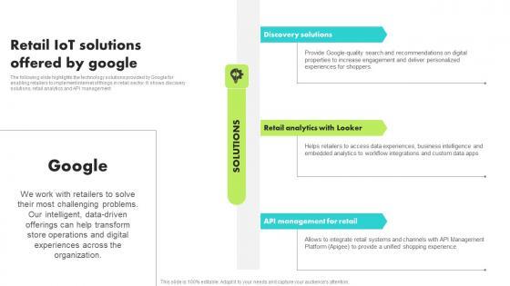 The following slide highlights the technology solutions provided by Google for enabling retailers to implement internet of things in retail sector. It shows discovery solutions, retail analytics and API management Retrieve professionally designed Retail IoT Solutions Offered By Google Guide For Retail IoT Solutions Analysis Introduction Pdf to effectively convey your message and captivate your listeners. Save time by selecting pre made slideshows that are appropriate for various topics, from business to educational purposes. These themes come in many different styles, from creative to corporate, and all of them are easily adjustable and can be edited quickly. Access them as PowerPoint templates or as Google Slides themes. You do not have to go on a hunt for the perfect presentation because Slidegeeks got you covered from everywhere. The following slide highlights the technology solutions provided by Google for enabling retailers to implement internet of things in retail sector. It shows discovery solutions, retail analytics and API management