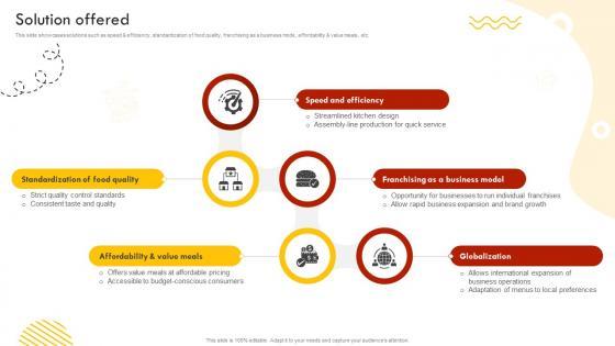 This slide showcases solutions such as speed and efficiency, st and ardization of food quality, franchising as a business mode, affordability and value meals, etc. If your project calls for a presentation, then Slidegeeks is your go to partner because we have professionally designed, easy to edit templates that are perfect for any presentation. After downloading, you can easily edit Solution Offered Fast Food Retail Chain Business Model BMC SS V and make the changes accordingly. You can rearrange slides or fill them with different images. Check out all the handy templates This slide showcases solutions such as speed and efficiency, st and ardization of food quality, franchising as a business mode, affordability and value meals, etc.