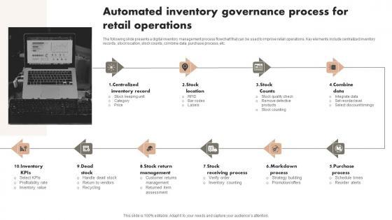 The following slide presents a digital inventory management process flowchart that can be used to improve retail operations. Key elements include centralized inventory records, stock location, stock counts, combine data, purchase process, etc. Showcasing this set of slides titled Automated Inventory Governance Process For Retail Operations Elements Pdf. The topics addressed in these templates are Inventory Record, Stock Location, Stock Counts. All the content presented in this PPT design is completely editable. Download it and make adjustments in color, background, font etc. as per your unique business setting. The following slide presents a digital inventory management process flowchart that can be used to improve retail operations. Key elements include centralized inventory records, stock location, stock counts, combine data, purchase process, etc.