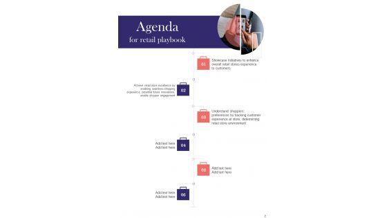 This is a Agenda Retail Outlet Experience Optimization Playbook Background PDF template with various stages. Focus and dispense information on five stages using this creative set, that comes with editable features. It contains large content boxes to add your information on topics like Potential Future Innovations, Retail Store, Store Environment. You can also showcase facts, figures, and other relevant content using this PPT layout. Grab it now.