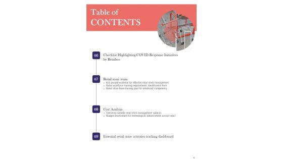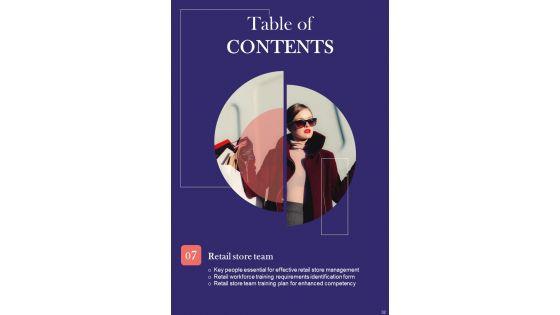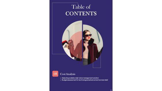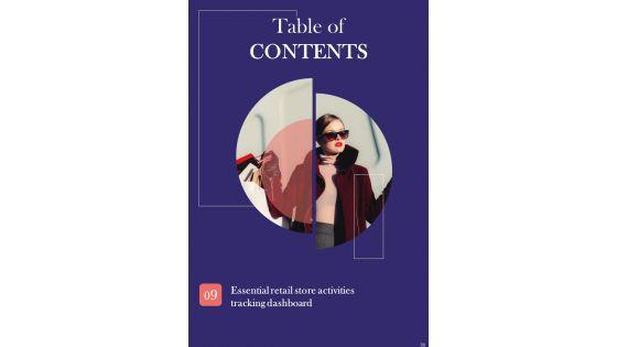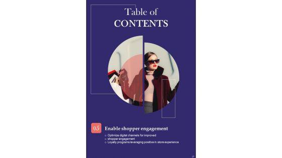 This is a Table Of Contents Retail Outlet Experience Retail Outlet Experience Optimization Playbook Inspiration PDF template with various stages. Focus and dispense information on nine stages using this creative set, that comes with editable features. It contains large content boxes to add your information on topics like Retail Store Team, Cost Analysis, Enable Shopper Engagement. You can also showcase facts, figures, and other relevant content using this PPT layout. Grab it now.