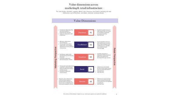 This slide provides information regarding different value dimensions associated to marketing and retail infrastructure such as functional, cost related, emotional, social and altruistic. Presenting Retail Outlet Experience Optimization Playbook Value Dimensions Across Marketing And Retail Infrastructure Background PDF to provide visual cues and insights. Share and navigate important information on two stages that need your due attention. This template can be used to pitch topics like Marketing Perspective, Retail Perspective. In addtion, this PPT design contains high resolution images, graphics, etc, that are easily editable and available for immediate download.