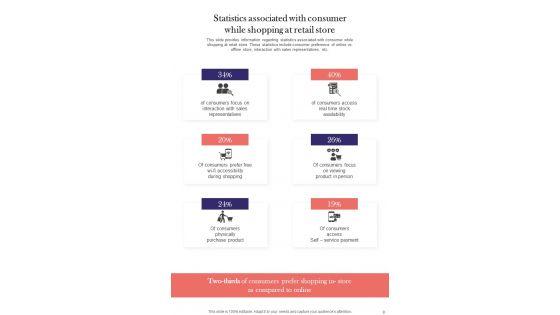 This slide provides information regarding statistics associated with consumer while shopping at retail store. These statistics include consumer preference of online vs. offline store, interaction with sales representatives, etc. Deliver an awe inspiring pitch with this creative Retail Outlet Experience Optimization Playbook Statistics Associated With Consumer While Shopping At Retail Store Guidelines PDF bundle. Topics like Purchase Product, Service Payment, Consumers Access can be discussed with this completely editable template. It is available for immediate download depending on the needs and requirements of the user.
