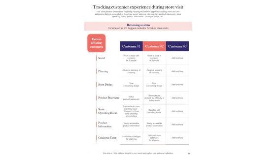 This slide provides information regarding customer experience during store visit and addressing factors associated to it such as social, store design, product placement, etc. Deliver and pitch your topic in the best possible manner with this transforming physical retail outlet considering customer experience during store visit themes pdf. Use them to share invaluable insights on operating, catalogue, placement, product and impress your audience. This template can be altered and modified as per your expectations. So, grab it now.