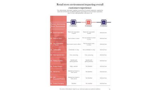 This slide provides information regarding assessment of customer experience impacted by retail store environment by addressing factors associated to it such as brand expectation, return to store, parking facilities, self service, etc. Presenting Retail Outlet Experience Optimization Playbook Retail Store Environment Impacting Overall Customer Experience Microsoft PDF to provide visual cues and insights. Share and navigate important information on three stages that need your due attention. This template can be used to pitch topics like Product Ranges, Self Service, Product Packaging. In addtion, this PPT design contains high resolution images, graphics, etc, that are easily editable and available for immediate download.