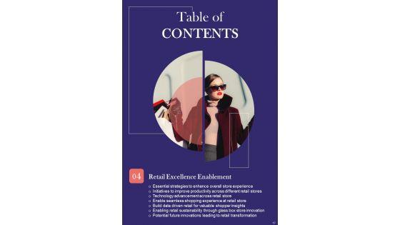 Presenting Table Of Contents Retail Outlet Experience Optimization Playbook Data Slides PDF to provide visual cues and insights. Share and navigate important information on one stages that need your due attention. This template can be used to pitch topics like Enabling Retail Sustainability, Retail Transformation, Essential Strategies. In addtion, this PPT design contains high resolution images, graphics, etc, that are easily editable and available for immediate download.