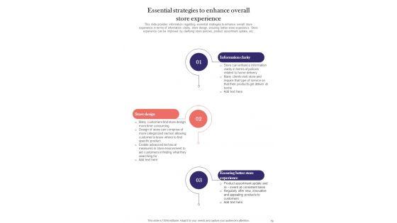This slide provides information regarding essential strategies to enhance overall store experience in terms of information clarity, store design, ensuring better store experience. Store experience can be improved by clarifying store policies, product assortment update, etc. This is a Retail Outlet Experience Optimization Playbook Essential Strategies To Enhance Overall Store Experience Slides PDF template with various stages. Focus and dispense information on three stages using this creative set, that comes with editable features. It contains large content boxes to add your information on topics like Store Design, Information Clarity, Store Environment. You can also showcase facts, figures, and other relevant content using this PPT layout. Grab it now.