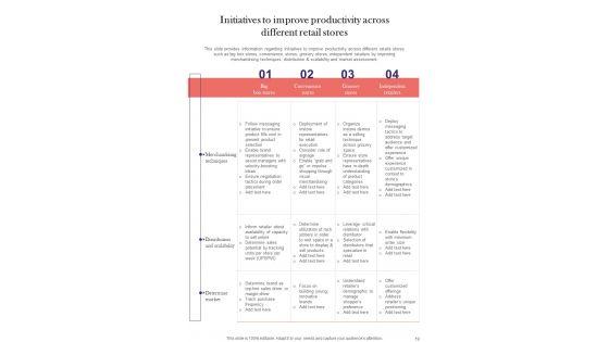 This slide provides information regarding initiatives to improve productivity across different retails stores such as big box stores, convenience stores, grocery stores, independent retailers by improving merchandising techniques, distribution and scalability and market assessment. Deliver and pitch your topic in the best possible manner with this Retail Outlet Experience Optimization Playbook Initiatives To Improve Productivity Across Different Retail Stores Summary PDF. Use them to share invaluable insights on Distribution And Scalability, Merchandising Techniques, Determine Market and impress your audience. This template can be altered and modified as per your expectations. So, grab it now.