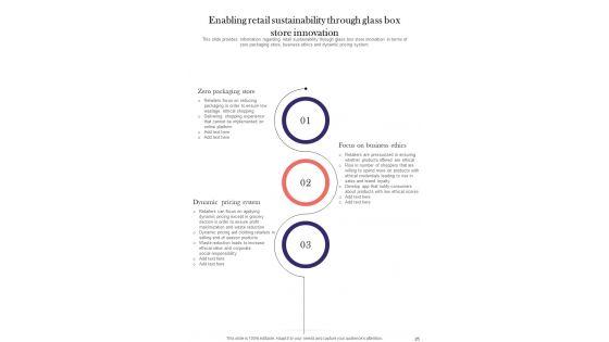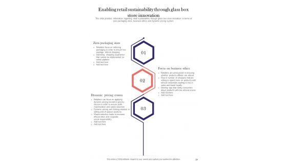 This slide provides information regarding retail sustainability through glass box store innovation in terms of zero packaging store, business ethics and dynamic pricing system. Presenting Retail Outlet Experience Optimization Playbook Enabling Retail Sustainability Through Glass Box Store Innovation Background PDF to provide visual cues and insights. Share and navigate important information on three stages that need your due attention. This template can be used to pitch topics like Business Ethics, Dynamic Pricing System, Zero Packaging Store. In addtion, this PPT design contains high resolution images, graphics, etc, that are easily editable and available for immediate download.