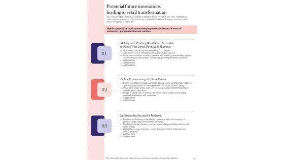 This slide provides information regarding potential future innovations in order to transform retail experience in terms of implementing sustainable initiatives, building co-working retail space accessible to public, etc. This is a Retail Outlet Experience Optimization Playbook Potential Future Innovations Leading To Retail Transformation Download PDF template with various stages. Focus and dispense information on three stages using this creative set, that comes with editable features. It contains large content boxes to add your information on topics like Implementing Sustainable Initiatives, Networking Opportunities, Potential Customers. You can also showcase facts, figures, and other relevant content using this PPT layout. Grab it now.