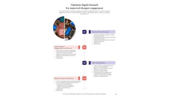 This slide provides information regarding optimization of digital channels for improved shopper engagement in terms of prioritize direct to customer, offer flexible options, enhance customers excitement, etc. Presenting Retail Outlet Experience Optimization Playbook Optimize Digital Channels For Improved Shopper Engagement Infographics PDF to provide visual cues and insights. Share and navigate important information on four stages that need your due attention. This template can be used to pitch topics like Offer Flexible Options, Enhance Customers Excitement, Social Listening Tools. In addtion, this PPT design contains high resolution images, graphics, etc, that are easily editable and available for immediate download.