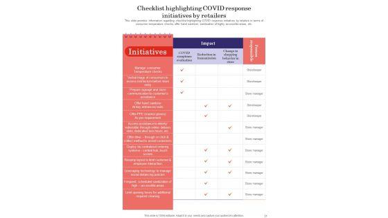 This slide provides information regarding checklist highlighting COVID response initiatives by retailers in terms of consumer temperature checks, offer hand sanitizer, sanitization of highly accessible areas, etc. Deliver an awe inspiring pitch with this creative Retail Outlet Experience Optimization Playbook Checklist Highlighting COVID Response Initiatives By Retailers Themes PDF bundle. Topics like Leveraging Technology, Store Communication, Symptoms Evaluation can be discussed with this completely editable template. It is available for immediate download depending on the needs and requirements of the user.