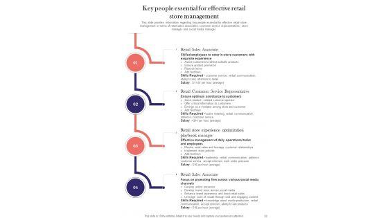 This slide provides information regarding key people essential for effective retail store management in terms of retail sales associates, customer service representatives, store manager and social media manager. Presenting Retail Outlet Experience Optimization Playbook Key People Essential For Effective Retail Store Management Rules PDF to provide visual cues and insights. Share and navigate important information on four stages that need your due attention. This template can be used to pitch topics like Service Representative, Retail Customer, Retail Sales Associate. In addtion, this PPT design contains high resolution images, graphics, etc, that are easily editable and available for immediate download.