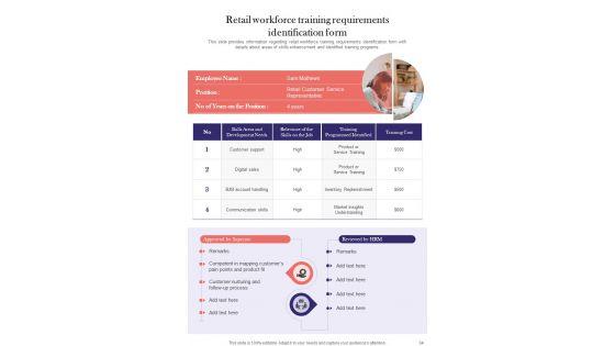 This slide provides information regarding retail workforce training requirements identification form with details about areas of skills enhancement and identified training programs. Deliver an awe inspiring pitch with this creative Retail Outlet Experience Optimization Playbook Retail Workforce Training Requirements Identification Form Graphics PDF bundle. Topics like Service Training, Customer Awareness, Inventory Management can be discussed with this completely editable template. It is available for immediate download depending on the needs and requirements of the user.