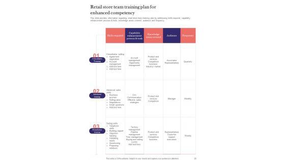 This slide provides information regarding retail store team training plan by addressing skills required, capability enhancement process and tools, knowledge areas covered, audience and frequency. Deliver and pitch your topic in the best possible manner with this Retail Outlet Experience Optimization Playbook Retail Store Team Training Plan For Enhanced Competency Microsoft PDF. Use them to share invaluable insights on Skills Required, Capability Enhancement Process, Opportunity Management and impress your audience. This template can be altered and modified as per your expectations. So, grab it now.