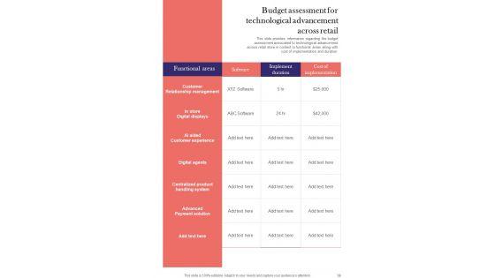 This slide provides information regarding the budget assessment associated to technological advancement across retail store in context to functional areas along with cost of implementation and duration. Presenting Retail Outlet Experience Optimization Playbook Budget Assessment For Technological Advancement Across Retail Download PDF to provide visual cues and insights. Share and navigate important information on four stages that need your due attention. This template can be used to pitch topics like Implement Duration, Cost Of Implementation, Customer Relationship Management. In addtion, this PPT design contains high resolution images, graphics, etc, that are easily editable and available for immediate download.