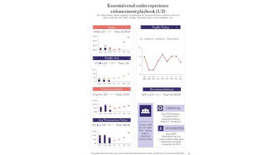 This slide provides details regarding the dashboard for tracking retail store activities in terms of sales, conversion rate, traffic, average transaction value, recommendations, etc. Deliver an awe inspiring pitch with this creative Retail Outlet Experience Optimization Playbook Essential Retail Store Activities Tracking Dashboard Demonstration PDF bundle. Topics like Low Conversion, Customers, Sales can be discussed with this completely editable template. It is available for immediate download depending on the needs and requirements of the user.