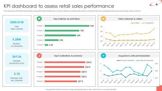 This slide covers KPI dashboard to analyze sales performance of retail store. It involves details such as total sales revenue, number of customers, average transaction price and average unit per customer. The Implementing Strategies To Enhance KPI Dashboard To Assess Retail Sales Performance is a compilation of the most recent design trends as a series of slides. It is suitable for any subject or industry presentation, containing attractive visuals and photo spots for businesses to clearly express their messages. This template contains a variety of slides for the user to input data, such as structures to contrast two elements, bullet points, and slides for written information. Slidegeeks is prepared to create an impression. This slide covers KPI dashboard to analyze sales performance of retail store. It involves details such as total sales revenue, number of customers, average transaction price and average unit per customer.