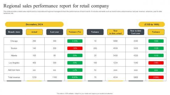 This slide provides a retail sales report used by corporate and regional managers to track the performances of each branch. It includes elements such as branch store, actual revenue, last year revenue, variances, year-to-date variances, etc. Showcasing this set of slides titled Regional Sales Performance Report For Retail Company Designs Pdf. The topics addressed in these templates are Branch Store, Actual, Last Year. All the content presented in this PPT design is completely editable. Download it and make adjustments in color, background, font etc. as per your unique business setting. This slide provides a retail sales report used by corporate and regional managers to track the performances of each branch. It includes elements such as branch store, actual revenue, last year revenue, variances, year-to-date variances, etc.