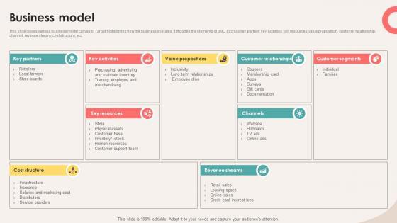 This slide covers various business model canvas of Target highlighting how the business operates. It includes the elements of BMC such as key partner, key activities key resources, value proposition, customer relationship, channel, revenue stream, cost structure, etc. Boost your pitch with our creative Business Model Retail Store Investor Elevator Pitch Deck. Deliver an awe-inspiring pitch that will mesmerize everyone. Using these presentation templates you will surely catch everyones attention. You can browse the ppts collection on our website. We have researchers who are experts at creating the right content for the templates. So you do not have to invest time in any additional work. Just grab the template now and use them. This slide covers various business model canvas of Target highlighting how the business operates. It includes the elements of BMC such as key partner, key activities key resources, value proposition, customer relationship, channel, revenue stream, cost structure, etc.