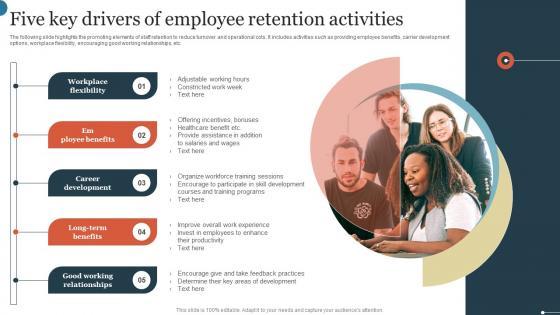 The following slide highlights the promoting elements of staff retention to reduce turnover and operational cots. It includes activities such as providing employee benefits, carrier development options, workplace flexibility, encouraging good working relationships, etc. Showcasing this set of slides titled Five Key Drivers Of Employee Retention Activities Designs Pdf. The topics addressed in these templates are Workplace Flexibility, Career Development, Long Term Benefits. All the content presented in this PPT design is completely editable. Download it and make adjustments in color, background, font etc. as per your unique business setting. The following slide highlights the promoting elements of staff retention to reduce turnover and operational cots. It includes activities such as providing employee benefits, carrier development options, workplace flexibility, encouraging good working relationships, etc.