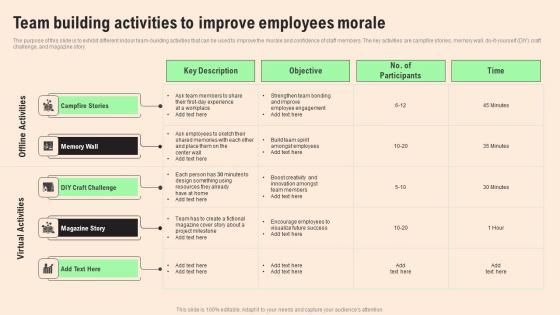 The purpose of this slide is to exhibit different indoor team-building activities that can be used to improve the morale and confidence of staff members. The key activities are campfire stories, memory wall, do-it-yourself DIY craft challenge, and magazine story. The best PPT templates are a great way to save time, energy, and resources. Slidegeeks have 100 percent editable powerpoint slides making them incredibly versatile. With these quality presentation templates, you can create a captivating and memorable presentation by combining visually appealing slides and effectively communicating your message. Download Successful Staff Retention Techniques Team Building Activities To Improve Employees Morale Slides PDF from Slidegeeks and deliver a wonderful presentation.